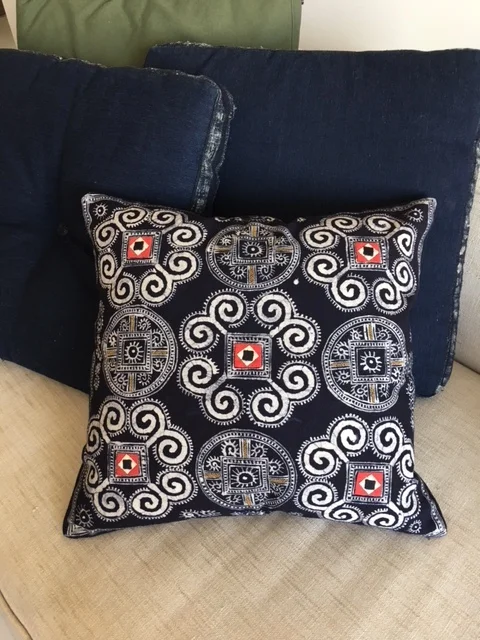 Truly one of a kind, these hemp and cotton textiles are handmade, dyed and embroidered with care. They are unique and very hard to find. We combine this vintage textile with various fabrics to create the perfect combination. Choices include: hand dyed silk velvet, stone washedheavy linen, 100% cotton, and natural ecru hemp. These cushions bring visual interest, vibrant color and rich textures that will enliven any space.
